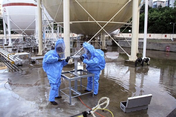 本次演練項(xiàng)目為: LPG1#儲(chǔ)罐底部出液管第一道法蘭墊片老化造成液化氣泄漏事故的應(yīng)急處置。主要流程為:模擬事故發(fā)生、報(bào)警、應(yīng)急啟動(dòng)、人員疏散、安全警戒、消防噴淋驅(qū)散燃?xì)庀♂対舛取岆U(xiǎn)堵漏及最終解除警戒等。在演練總指揮葉春總經(jīng)理的指揮下,所有參演人員嚴(yán)肅認(rèn)真、有條不紊地推進(jìn)各個(gè)步驟,歷時(shí)一個(gè)小時(shí)后,演練圓滿完成。