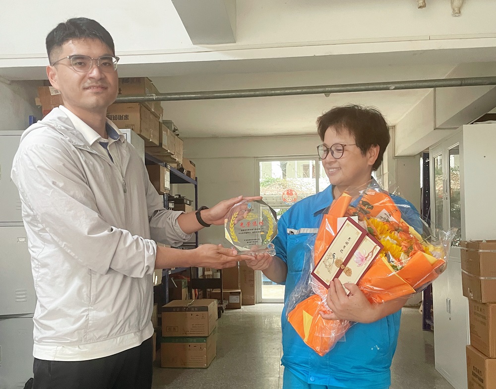 5 月 21 日,副總陳濤濤同樣為黃素萍同志獻上鮮花等禮物。接過禮物的黃素萍同志激動地表示:“謝謝公司領導的關心和祝福,退休對我來說是一個新的開始,我會帶著公司的美好回憶,開啟新的生活旅程” 最后,副總陳濤濤殷切希望,能有更多的同事在公司提供的這個大平臺上光榮退休。