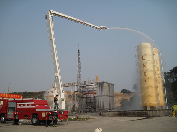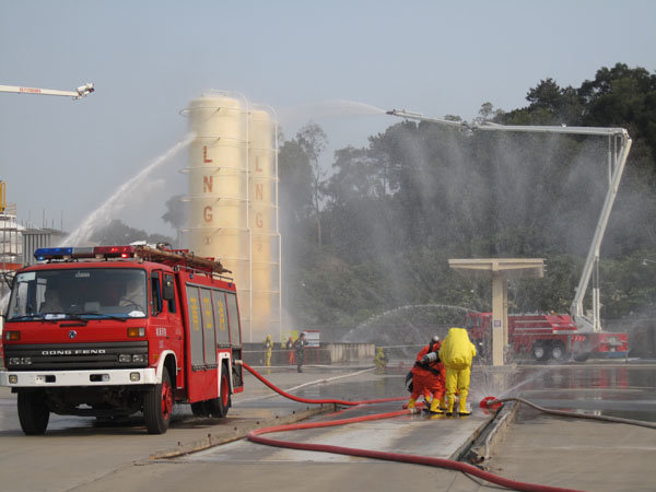 1530分,隨著生產(chǎn)部報(bào)警聲響起,LNG灌區(qū)發(fā)生泄漏,現(xiàn)場(chǎng)指揮接警后立即按響報(bào)警器,指揮相關(guān)小組啟動(dòng)消防水泵,對(duì)灌區(qū)進(jìn)行緊急噴淋,隔離相鄰儲(chǔ)罐,并組織員工按預(yù)定區(qū)域到達(dá)避難位置。市消防派出2輛高噴消防車、6輛水罐消防車到達(dá)起火現(xiàn)場(chǎng),火情偵檢組隨即展開偵檢,先用泄露儀對(duì)現(xiàn)場(chǎng)進(jìn)行濃度檢測(cè),并用隔離帶劃出相應(yīng)的警戒線,保安配合警戒組疏散區(qū)域內(nèi)無關(guān)人員及在場(chǎng)使用中的車輛熄火,同時(shí)關(guān)閉大門,禁止除消防車、搶險(xiǎn)車外的一切車輛出入。在得知了著火位置和泄漏程度后,中隊(duì)指揮員立即下令,展開滅火行動(dòng)。消防隊(duì)員穿上消防戰(zhàn)斗服、佩戴防毒面具和呼吸器、攜帶銅質(zhì)工具和滅火器材迅速趕往事故儲(chǔ)罐,關(guān)閉儲(chǔ)罐根部所有閥門。而其余消防車按照預(yù)期指定位置,全方位對(duì)LNG灌體進(jìn)行火災(zāi)撲救。