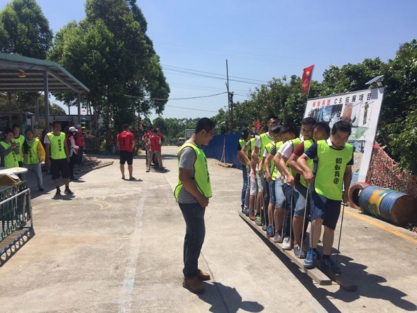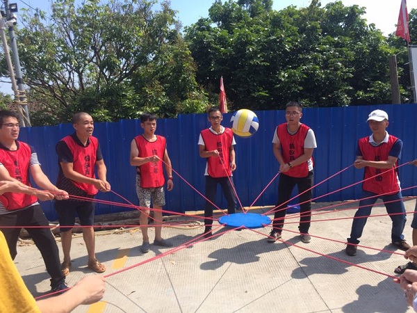 團隊在當天上午9點半左右到達目的地,經(jīng)過短暫的休息后,進行了分組團隊建設(shè)及熱身小活動。緊接著,作為活動的第一個項目“無軌列車”隆重登場了,本項目要求團隊成員雙腳分別站在兩塊長約5~8米,安裝有10個提繩的長條木板上并手握提繩,行走一定的距離。由于剛開始大家沒有找到項目的技巧,舉步難行,兩隊都是東倒西歪,經(jīng)過磨合溝通后,最終順利地完成了比賽。該項目提升了團隊激情及凝聚力。
