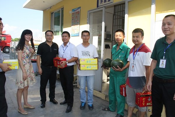 2014年7月29日,由集團總裁辦、人力資源中心組成的高溫慰問團代表集團進(jìn)行莆田區(qū)域的高溫慰問活動,為在戶外高溫作業(yè)的一線員工送去消暑慰問品,曠遠(yuǎn)能源股份有限公司副總經(jīng)理黃劍鋒陪同慰問。